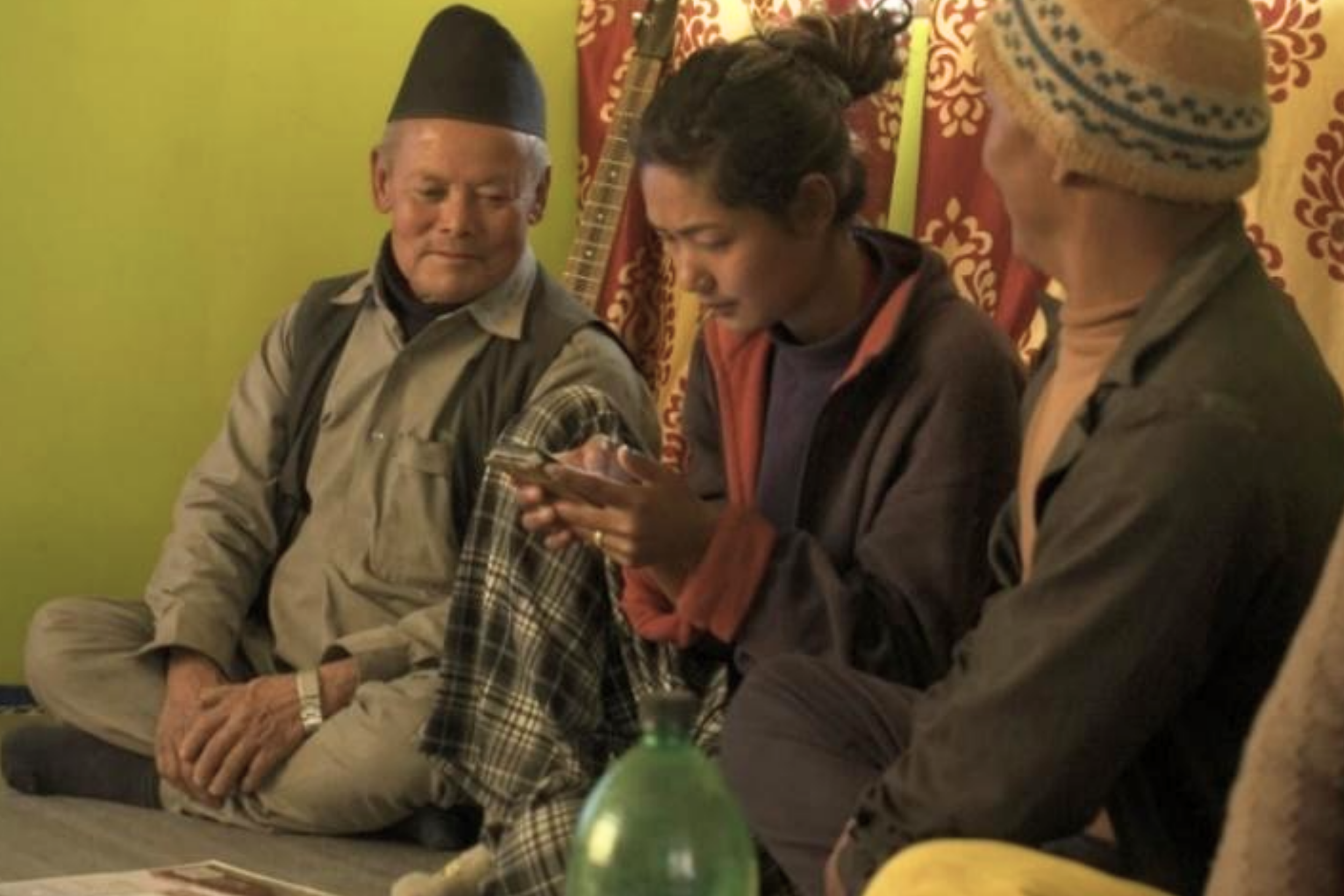 A young girl gets access to an elderly farmer’s smartphone, which she uses to follow instructions and guide him